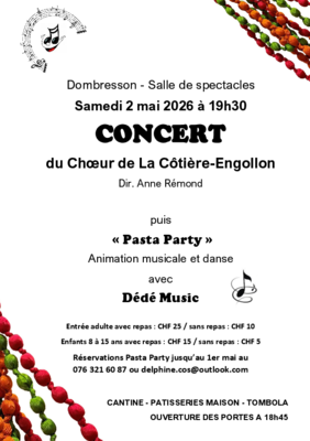 A 19h30 Concert du Choeur de La Côtière-Engollon (ensemble féminin) puis Pasta Party suivie d'une animation musicale avec Dédé Music ! Cantine - Pâtisseries maison - Tombola